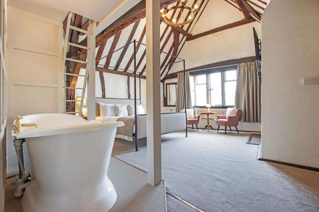 The Kings Arms dates to the 1400's and was featured in Four Weddings and a Funeral, Miss Marple, and Midsomer Murders. Located in the heart of historical Old Amersham, the pub has 35 characterful bedrooms, and is surrounded by independent boutiques, antique shops, and other pubs. Heathrow Airport is half an hour away, and there is good access to the M40. For the ultimate luxury book a suite.