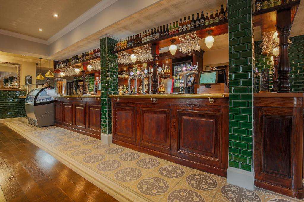 The bar is well-stocked with real ales, lagers, bottled beers, wines, and spirits. Guests can also enjoy a cocktail from the gin and rum list.