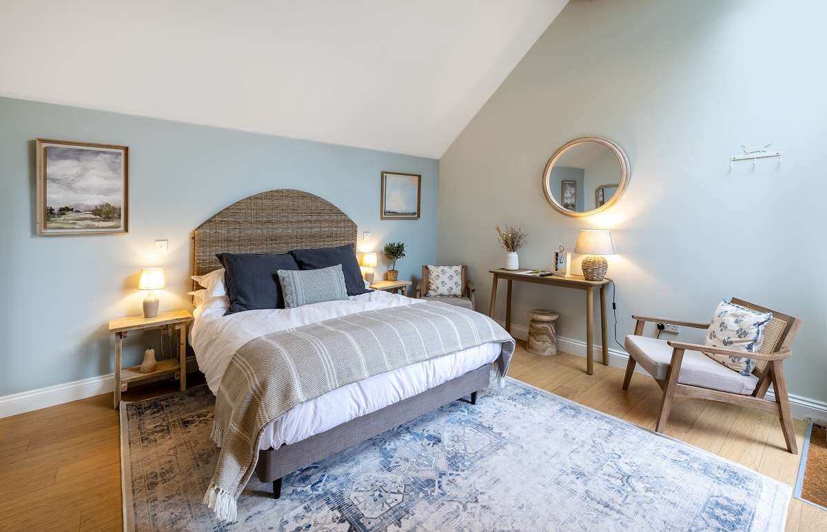 Behind the pub, there are six en-suite bedrooms, each offering comfort and character and a private entrance for a touch of peace and privacy. Each room comes with thoughtful details like soft down duvets, fine cotton sheets, and natural Bramley bath products. Two of the double rooms have an adjoining door and are perfect for families. Dogs can also be added at the checkout.